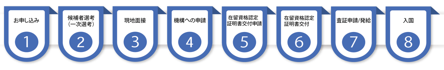 候補者の募集から配属実習開始まで概ね半年程度の時間を要します。 その間に渡航のための申請と、日本語学習を行います。
