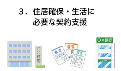 住居確保のお手伝いや銀行口座の開設や携帯電話の契約等の案内をいたします。各種手続きのサポートやアドバイスをいたします。