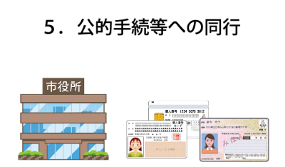 必要に応じ住居地、社会保障、税などの手続の同行、書類作成の補助をいたします。