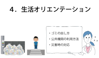 円滑に社会生活を営めるよう日本のルールやマナー、公共機関の利用方法や連絡先、災害時の対応等の説明いたします。